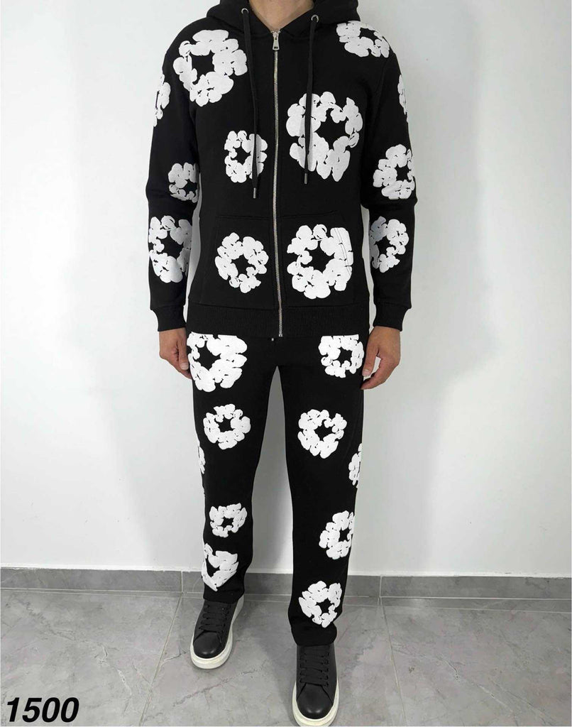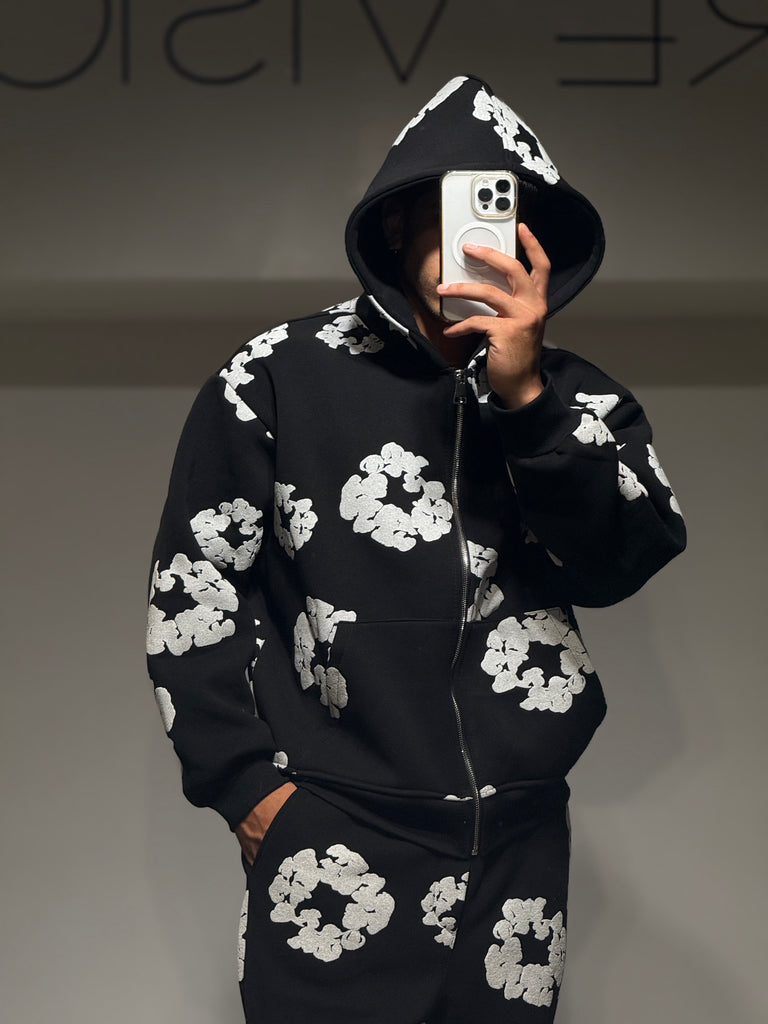 Ensemble Veste et Pantalon Jogging à Fleurs Noir et Blanc